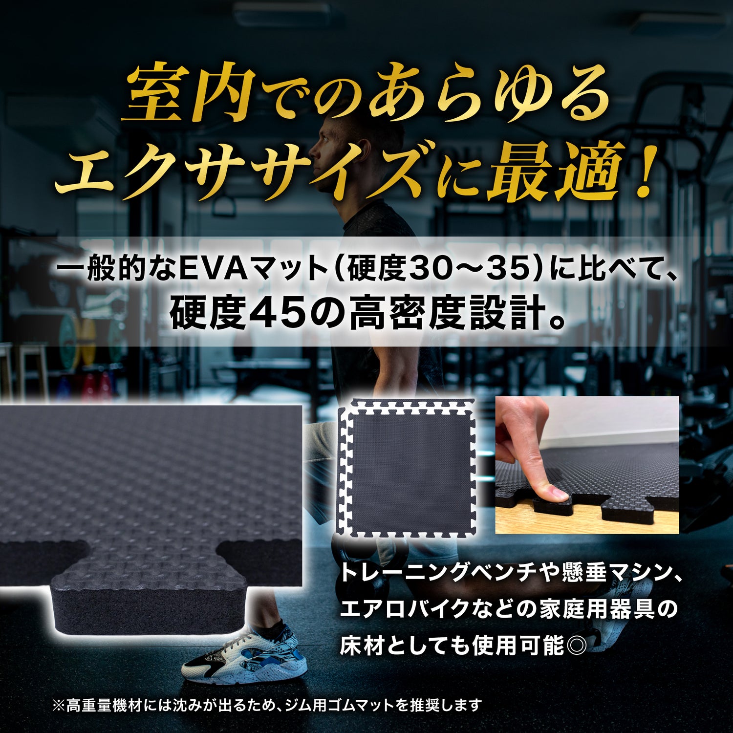 市場に出ている一般的なEVAマットは硬度が30-35に設定されていますが、本商品は高密度設計で硬度が45と若干硬めに設定されています。そのためトレーニングベンチや懸垂マシン、エアロバイクといった家庭用トレーニング器具の床材としてもご利用いただけます(重量物を置くとマットに凹み跡が残る場合がございます)。