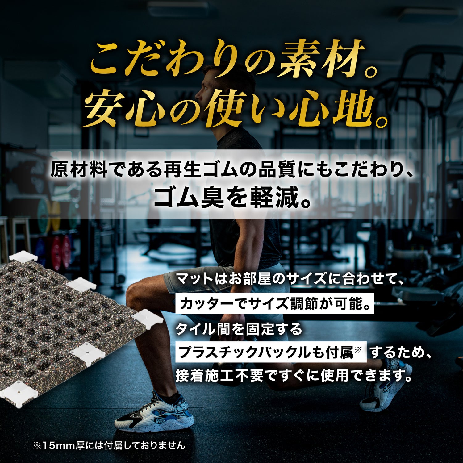 大型商業ジムでの利用を想定したマットです。タイル間をバックルで接続できるので床に並べるだけで敷設できます。接着施工もいらないため原状回復も簡単です。ダンベル等のドロップが想定される場合でも利用できます。